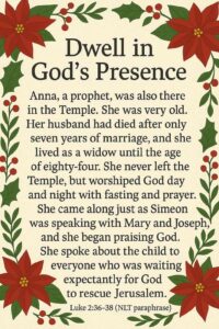 Dwelling in God’s presence shapes our perspective. It anchors us in hope, sharpens our spiritual vision, tunes our ears to listen to our Creator, and turns waiting into worship. Like Anna, and Simeon when we abide with God, we become witnesses to redemption.