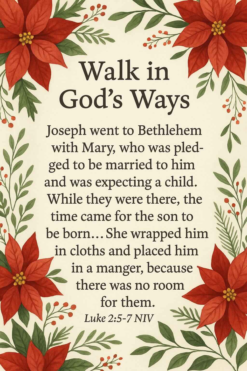 Walking in God’s ways doesn’t always lead us where we expect, but it always leads us where His purposes are fulfilled. Sometimes the road God chooses includes a manger instead of a guest room—but His presence makes even humble places holy.