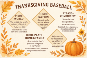Want a new spin on the faithful habit of thankfulness? Try Thanksgiving Baseball! You can play it inside around the table or for extra zest (and to burn more calories) try playing it outside on a baseball diamond. The rules are simple: Inside: everyone goes around the bases together and say something they are thankful for in the world, tne aation, the community and their home. (You can also pray a prayer that includes what you are grateful for.)