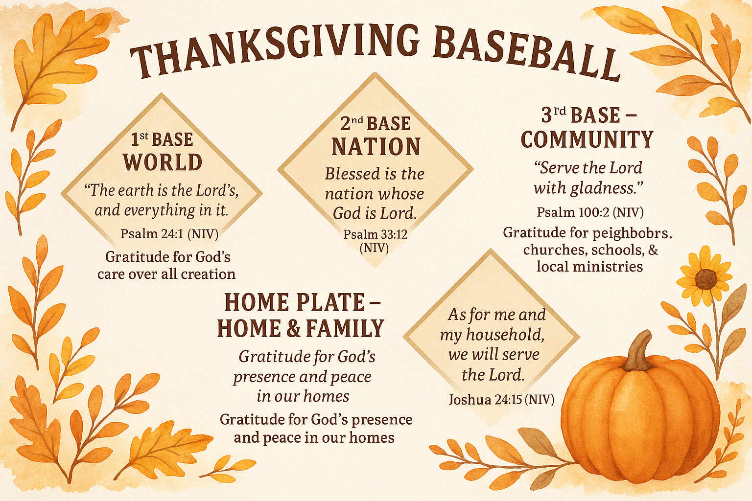Want a new spin on the faithful habit of thankfulness? Try Thanksgiving Baseball! You can play it inside around the table or for extra zest (and to burn more calories) try playing it outside on a baseball diamond. The rules are simple: Inside: everyone goes around the bases together and say something they are thankful for in the world, tne aation, the community and their home. (You can also pray a prayer that includes what you are grateful for.)